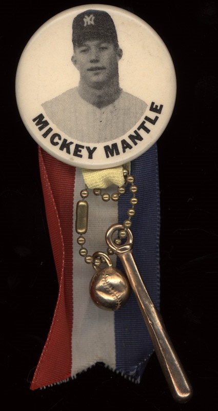 Scarce variation with portrait and white background. 1.75'' in diameter with bat and ball charm along with red, white and blue ribbon. Some minor rusting on the back and slight indentation about 2 o'clock. Overall Excellent to EX-MT.