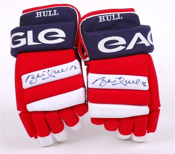 Eagle WC04 Model Gloves worn by Bobby Hull. Hull's name and "JCC" are stitched on each glove and both are signed in black sharpie along with Hull's number. Shows only very light use.
