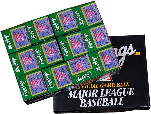 Two boxes of unopened Joe DiMaggio commemorative Official American League (Budig) baseballs made by Rawlings. There are 12 individually boxed balls per larger opened box. Balls have blue stitching and a commemorative NY Yankees/Joe DiMaggio Logo that depicts the image of Joe D. wearing his #5 as a part of the NY logo. Legendary!