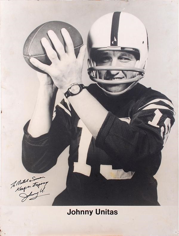 This poster has a great image of the man many consider to be the greatest quarterback of all-time, Johnny Unitas; it measures 24 x 32" and is in VG condition with only some very minor tears around the edge of the poster. The inscription and signature is not authentic but the massive hands and glowing smile that are both trademarks of Unitas certainly are.