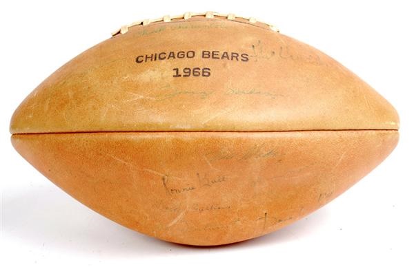 The 1966 Chicago Bears sported a record of 5-7-2. This included 2 victories over rival Minnesota and a big win over the Baltimore Colts. This was the first year that the professional football season would end with an AFL and NFL team squaring off for the Championship in the inaugural Super Bowl. The '66 Bears also had a close loss that year to the eventual Super Bowl 1 Champion Green Bay Packers 13-6. This Wilson 1966 Chicago Bears inscribed faded football is signed by Brian Piccolo, George Halas, Gale Sayers, Mike Ditka, Dick Butkus, Rosey Taylor, Dave Whitsell and 24 others. Several of the signatures are quite faded and illegible although the named players above are in fact legible. Great piece of Bear history. Comes with a PSA/DNA LOA.