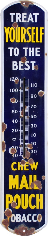 These advertising thermometers are a prime example of all the different things people used in the early 20th Century as advertising vehicles. The Fatima thermometer measures 7 x 27" and is in G/VG condition with some rust spots on the top and bottom. The Mail Pouch tobacco thermometer is much larger measuring 8 x 39" and is in G shape with 1/2"-1" rust spots peppered throughout the piece, which could possibly be restored.