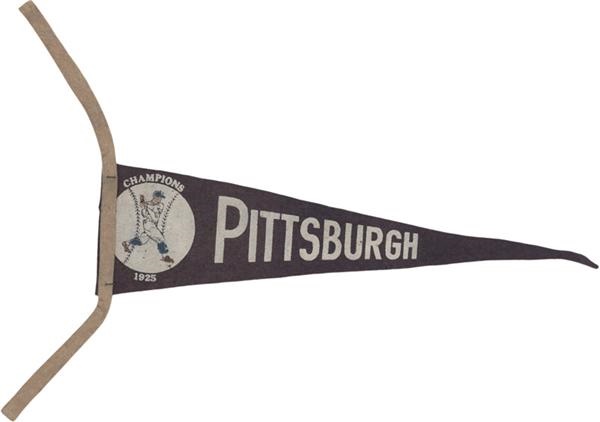 This 1925 Pittsburgh Pirates Champions 8" Mini Pennant is in excellent condition for its age. The pennant is complete with no missing corners or sections. The paint is also in incredible condition, all the lettering is completely intact, even the detail on the baseball player on the ball is complete with the colors still present and literally no cracking. The tassel is fully intact with no tears to the felt. It is rare to come across a pennant this age in such great shape, it is truly a treasure and a must have for any collector of early Pirates memorabilia.