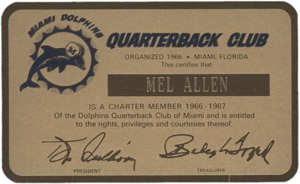 This brass card certifies that Mel Allen is a charter member of the 1966-67 Dolphins Quarterback Club of Miami. Apparently the card entitled the bearer to a variety of privileges and courtesies. The card is in EX shape with only a few minor scratches. The other great thing about this card is that it dates from a critical year in Dolphin’s history, the first year the team was included in the AFL.