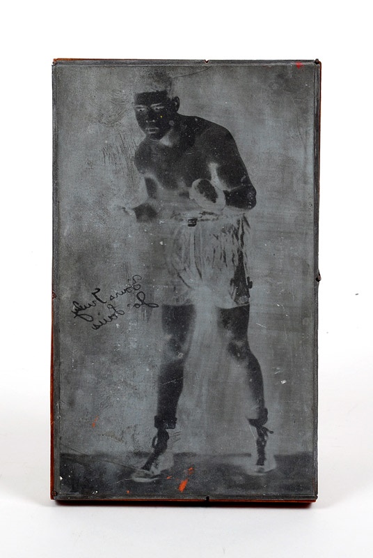 This is a truly unique item. The printing plate which clearly shows the image of world champion pugilist, Joe Louis dates from the 1940’s. The stone plate measures 5 x 8 ?” and is mounted on a wooden board of the same size. The negative image is quite stunning and is a work of art in and of itself. It already has hanging hardware attached and is ready to enhance any boxing memorabilia collection.