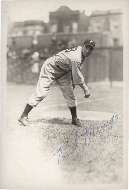 This George Burke photo of Van Mungo captures the MLB pitcher just after throwing out a pitch. The 4 x 6” photograph is in EX condition and like many vintage Burke photographs is a portrait quality image with a beautiful matte finish.  The photo is signed in blue ball point ink on the bottom by Van L. Mungo and the autograph rates an 8 out 10.  The photograph includes a JSA authentication.