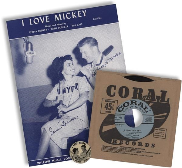 This is the "I Love Mickey" 45 RPM record, music score sheet and 1 1/2" pin for the song that was recorded in 1956 by Mickey Mantle and Teresa Brewer. Brewer would sing "I Love Mickey", and he would reply "Mickey Who?" (She) "You know the fella with the celebrated swing...." The record is a not for sale sample copy and is in excellent condition with the original sleeve which is also EX with only a few wrinkles and two slight tears along the top edge. The pin and music score are also EX. The Song came into being one day when Teresa Brewer was at a Yankee game watching Mickey in action. While leaving The Stadium Teresa commented to her friend "That Mantle is terrific! Someone should write a song about him". Teresa started singing and her friend chimed in and they had a few bars written. They presented the song to Mickey, and Mantle said "Great", and recorded the song with Teresa. In 1956 the song was also featured in Rock & Roll Songs Magazine and on September 29, 1956 "I Love Mickey" peaked at #87 on the charts.