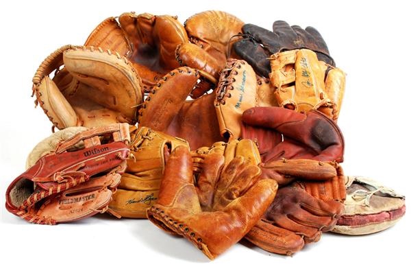 Vintage baseball glove collection (15) with some that are signed. Signed gloves include a Hank Bauer Model Pennant F-60, Ron Guidry Fieldmaster Wilson A2624, Enos Slaughter Sonnett I4F lefty, Moose Skowron Model Denkert ST10, Catfish Hunter endorsed Wilson A2965, John Blanchard Rawlings RJ36 and a Jake Gibbs Featherweight Model MacGregor 40 catcher's mitt. Unsigned models include a Gus Triandos Wilson A2573 Autograph Model catcher's mitt, Rawlings 222 Professional Model, Rawlings PM5X, 1920's models catcher's mitts (2). There is also a "Designed by" Ted Williams Wilson Model 1680. The Mel Ott is a Gold Smith horse hide with facsimile signature. A great catch!