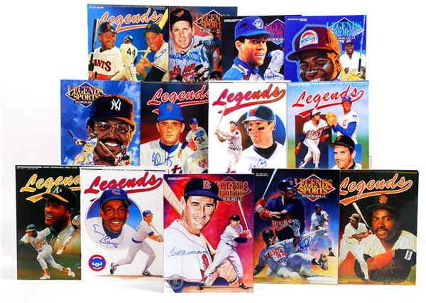 Collection of Legends Magazines signed by the Hall of Famer / Star Pictured on the cover. Includes Ted Williams, Nolan Ryan, Tony Gwynn (2 different), Roberto Alomar, Brooks Robinson, Willie Mays, Reggie Jackson, Kirby Puckett, Will Clark, Gaylord Perry, Rickey Henderson and Ernie Banks. Several have the original ticket from the show at which they were signed. Mint with bold signatures.