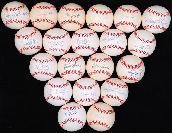 Nice collection of nineteen baseballs, the majority being single signed. Includes a single signed Cal Ripken Jr. (w/ Ripken Hologram), Ryne Sandberg, Dennis Martinez, Willie Stargell, George Brett, Joe Morgan, Juan Gonzalez, Ivan Rodriguez (2), Ruben Gomez (2), Tony Perez, Scott Rolen, Jim Edmonds, Carlos Lee, and more. Balls are mostly official and in very good and better condition with the average signatures rating 7-9 out of 10.