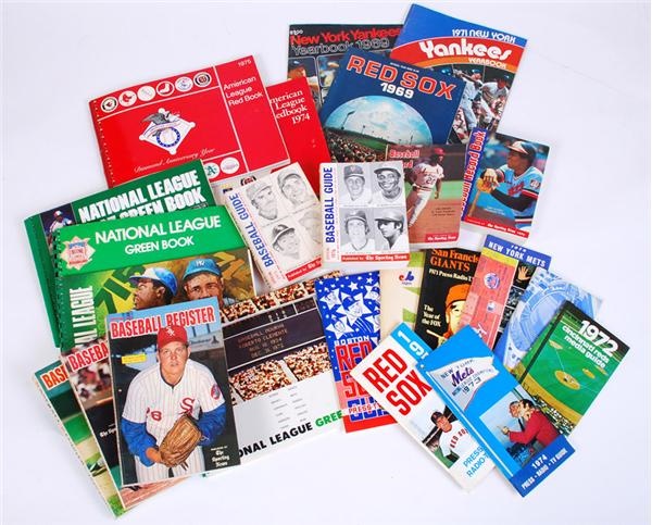 Includes: 1969 media guides (Senators, Mets, Red Sox, Yankees, Orioles), 1970 media guides (Red Sox, Yankees, Pirates, Mets x2), 1971 media guides (Giants, Expos, Red Sox, Tigers, Yankees x2, Mets) 1972 media guides (Cubs, Giants, Orioles, Phillies, Expos, Athletics, Cardinals, Padres, Red Sox, Dodgers, Mets, Astros, Pirates, Rangers, Yankees, Twins, Royals, Reds), 1974 media guides (Red Sox, Mets), 1975 media guides (Red Sox, Yankees x2), 1976 media guides (Red Sox, Mets x3), 1977 media guides (Yankees, Mets), 1978 media guides (Yankees, Mets), 1980 media guides (Yankees, Mets) 1981media guide (Yankees), 1983 media guide (Yankees), 1990 media guide (Yankees), The Sporting News Official Baseball Register (1970, 1972, 1973, 1974 x3, 1975 x2, 1976 and 1978), TSN Official Baseball Guide (1966, 1970, 1972, 1973, 1974, 1975, 1976), TSN The Official Baseball Record Book (1972, 1973, 1975, 1976 x2), TSN Official World Series Records (1903-1970, 1903-1975, 1903-78), NY Yankees Oranizational Record Book (1972, 1973, 1974, 1976, 1977), American League Red books (1969, 1971, 1972, 1973, 1974, 1975), National League Green books (1969, 1970, 1971, 1972, 1973, 1975, 1980, 1987), Yearbook (1969 Red Sox, 1969 Yankees, 1971 Yankees) and more. Light staining and mild wear throughout overall VG to EX with some better and some worse.
