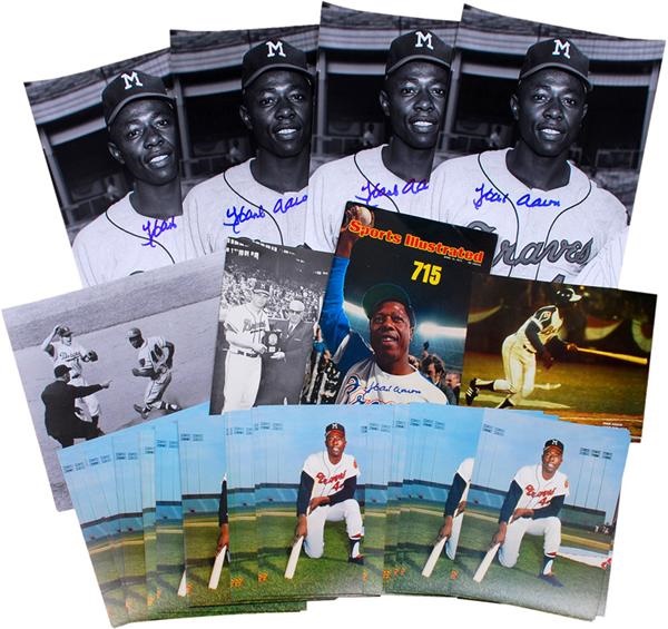 Collection of five different signed and unsigned photos with multiple copies of each making for a total lot of 200+ photos. Also includes an April 15, 1974 Sports Illustrated with Aaron on the cover and signed in mint blue sharpie by the now former HR Champion.