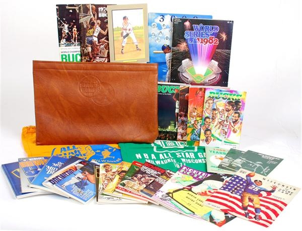 For Milwaukee sports fans this is quite the haul. Included in this lot is an extensive collection of Milwaukee Brewers and Milwaukee Bucks Media guides. The media guides for the Brewers date from the 1970’s through the 90’s. The Bucks, Official Radio and TV guides date from the 1960’s through the 1990’s. There is even a media guide for the 1969 Seattle Pilots and a 1970 phantom guide since by 1970 the team which moved to Milwaukee was now defunct. Some other articles included in this lot are a beautiful Perez Steele Gallery watercolor of Milwaukee Braves star Warren Spahn signed across his legs in blue felt tip marker. There is also a Robin Yount 2 time MVP commemorative pin and 2 ticket stubs to a Brewers vs. A's game on Sept 27, 1992. There are also 2 canvas All-Star game bags, a 1977 NBA and a 1975 MLB, perhaps used to carry game souveniers. The lot is generally in VG/EX condition some of the books would even rank as NRMT.