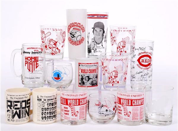 This collection includes 39 commemorative glasses spanning the 1950's, 60's, 70's and 80's and 4 championship mugs. One glass is specifically dedicated to the Red's most famous inflielder, Pete Rose. The collection is in EX condition with no chips or scratches. Many glasses, most of which you may remember purchasing at gas stations as a child, have other advertisers on them as well also making the collection a great example of late 20th century Mid-Western Americana.