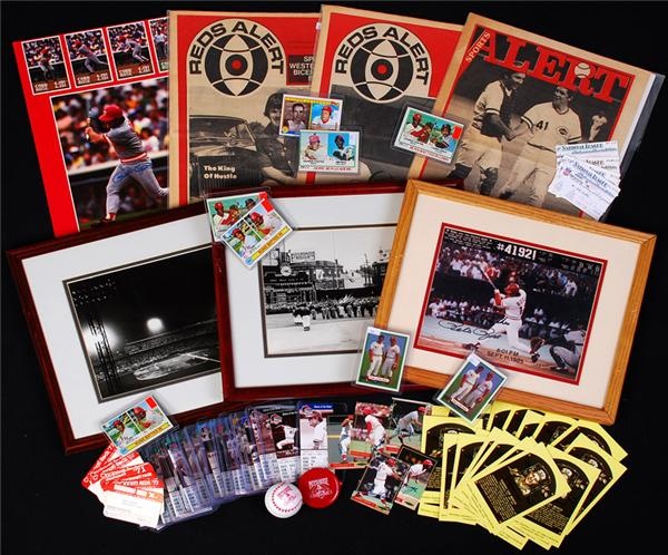 A massive Cincinnati Reds collection of memorabilia (250+) with lots of variety. It includes a Pete Rose signed Time Magazine dated August 19, 1985 and a limited edition signed and numbered (971/1000) Spectrum Diamond Club Reds 5 card team set including Bench, Morgan, Perez, Foster and Guillet with COA. There are playing cards, key chains, matchbox trucks, pins, parking tickets, post cards, two MacGregor Coca Cola Commemorative adult leather baseball gloves, a Pete Rose signed beer mug, a Crosley Field Hudepohl Beer wall hanger, collection of 2002 Reds game tickets (100+), a signed framed Pete Rose hit # 4192 photo, and much more.