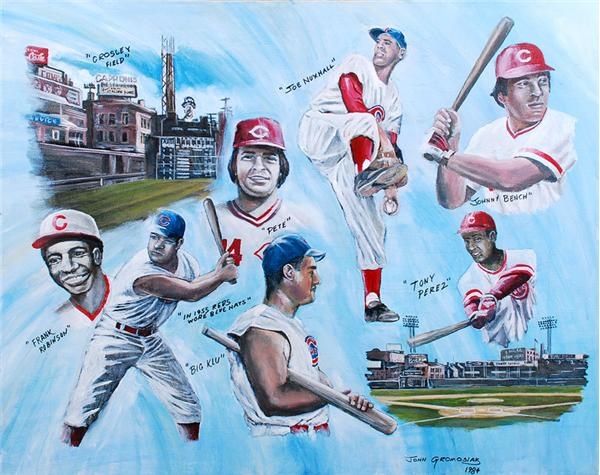 The original canvas painting by artist John Gromosiak measures 24 x 30" and dates from 1984. The painting features some of Cincinnati's greatest players, like Frank Robinson, Johnny Bench, Tony Perez, Joe Nuxhall, Big Klu and of course Pete Rose. There is also an image of Crosley field in the painting. The quality of the portraits is EX capturing life like images of the players. The colors are rich yet muted shades of blues, grays and browns to help off-set the traditional Cincinnati Red. The painting is in overall EX/NRMT condition.