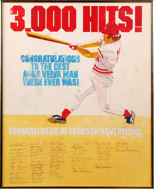 This original artwork was used to make an advertising poster. The watercolor illustration measures 22 x 27" and shows some excellent craftsmanship. Unfortunately the signatures on the bottom are not authentic and the piece does have a fairly significant amount of water damage which has caused some of the colors to bleed giving it a G rating. It is still an interesting original work that features the legendary Pete Rose.