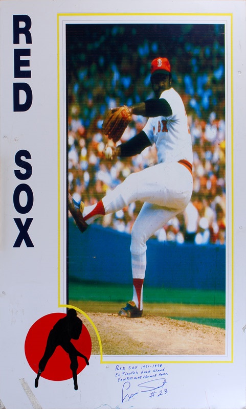 This 29 1/2 x 48 1/2" metal sign of "El Tiante" actually hung in Fenway Park. The sign features a photograph of Luis Tiant gearing up for a pitch. The sign is autographed by Tiant in blue sharpie with the inscription " Red Sox 1971-1978, El Tiante's Food Stand Yawkey Way, Fenway Park." The sign is in VG/EX condition with no rust and minimal scratches and markings. This is a great collectible for Red Sox and especially "El Tiante" fans out there.