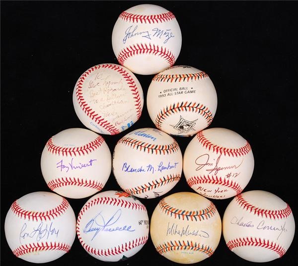 Huge collection (40+) of signed baseballs. Some are single, others multi-signed and many are commemorative balls from World Series and All-Star games. Signatories include Negro Leaguers, HOFers, top baseball brass, astronauts, Womens Leaguers and politicians. Grouping includes balls signed by Ron LaFleur, Bert Blyleven, Gary Gaetti, Catfish Hunter, Johnny Mize, Ted "Double Duty" Radcliffe, Mike Mussina, Ron Hansen, Eddie Sawyer, Bubba Church, Bill Nichols, Jimmie Foxx, Fay Vincent, Max Manning, Gene Benson, Wilmer Fields, Bill Cash, Mahlon Duckett, Jim Cohen, AAGPBL (All American Girls Baseball League Players) , Joe Hauser, Wally Schirra (astronaut), Charles Comiskey Jr., Boog Powell, Jim Spencer, Jack Fisher and Senator George Mitchell among others.