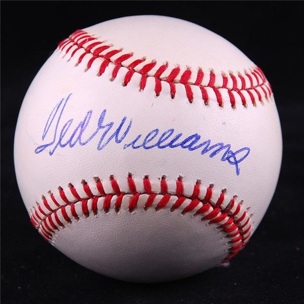 Some say Williams was the greatest hitter of all time. Hard to argue with a lifetime batting average of .344. Williams holds the highest career batting average of anyone with 500 or more home runs. His career year was 1941, when he hit .406 with 37 HR, 120 RBI, and 135 runs scored. He also batted over .400 in two other seasons. This nice Rawlings OAL (Brown) white ball sports Teddy ballgame signature in bold blue ball point ink on the sweet spot.