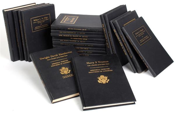 Large collection of presidential and congressional memorial hard cover books (100). Each book contains memorial tributes given by congressional brethren as well as various articles and editorials relating to the life and work of the deceased. Many of the books are signed by either the appointed or elected successor. Included is Harry S. Truman (11), Dwight D. Eisenhower, Nelson A. Rockefeller, Richard Brevard Russell, Charles S. Teague, Adam Benjamin, Henry Styles Bridges, L. Mendel Rivers, Richard Lewis Neuberger, Albert Thomas, Matthew Mansfield Neely, Everett McKinley Dirksen, Sam Rayburn, Robert Taft.