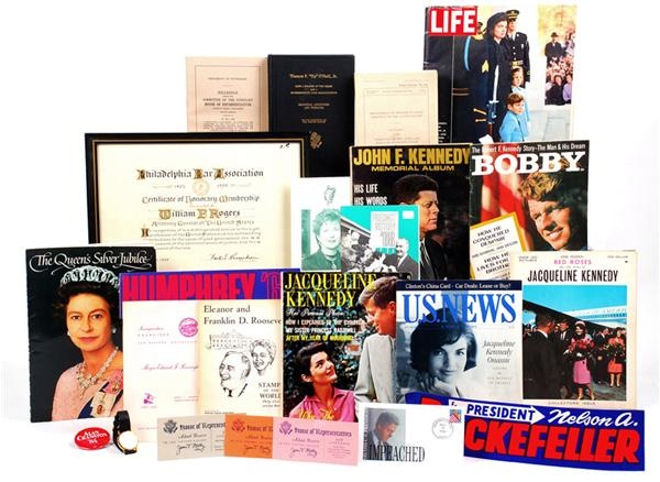 This is a vast colection of a whole host of Political memorabilia. There are well over 50 pieces in this lot which range from bound memorial tributes, to campaign buttons and bumper stickers, to letters addressed to various members of the government, photographs and various magazines. Some pieces that are rather interesting are a genuine piece of wood from the Texas School Book Depository Building, an 11 x 14 photograph that captures then President Ronald Reagan getting set up for a televised speech, tickets to various events such as one of Jimmy Carter's State of the Union Addresses, and such iconic campaign paraphenalia as a button that says,"I Like Ike." The collection covers the last 50 years in American Political History and will not doubt provide hours of entertainment as you peruse through this incredible assortment of materials.