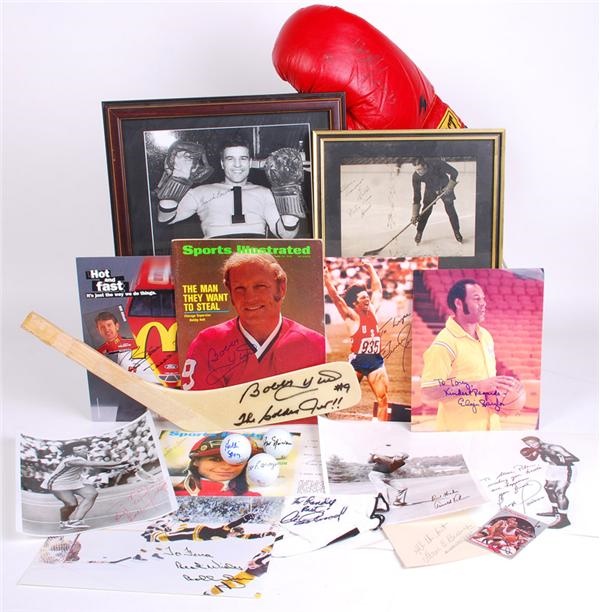 This incredible collection of memorabilia contains (58) individually signed pieces on everything from index cards, to golf balls, to a soccer ball, and of course a myriad of photographs. A few items of note: a red everlast boxing glove signed by world champion Evander Holyfield, an Upperdeck Olympic card signed by Gold Medal winner Dick Button, highly regarded as a revolutionary in the world of figure skating and various signed 8 x 10" photographs of sport's legends like Arnold Palmer and Bruce Jenner. The great thing about this lot is that it encompasses all types of sports from track and field, to tennis, to diving, to golf, and often these athletes do not get the same recognition as other athletes, but with this lot you can appreciate the talents of all these different types of athletes.
