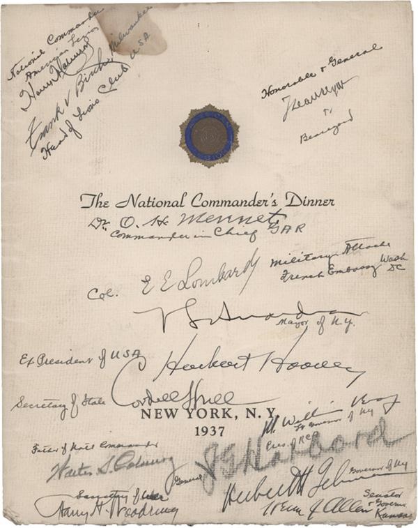 Program for the National Commander's Dinner signed on the cover by several politicians including President Herbert Hoover, Fiorello Laguardia, and more. Next to the signature, the title of the person is noted in a different hand. All signatures are bold. Overall Excellent.
