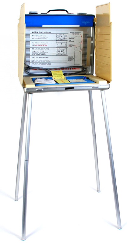 A real piece of political Americana! This is an actual voting machine used in the 2000 Bush vs. Gore Presidential contest in Palm Beach, Florida. The crux of the much disputed vote count in the state of Florida, this lot is complete with the voting machine, voting instructions, punch card stylus, stack of unused test and sample ballot punch cards, chads from Election 2000 (loose in bottom of metal case), metal carrying briefcase, four collapsible legs, 15 watt fluorescent light and electrical cord. All of this packs up into a metal briefcase. Dimensions & Specs: (Standing) Height: 5 feet 1 inch, Width: 30 inches, Depth: 26 inches, Weight: 25 pounds. Dimensions & Specs: (Packed Up into Metal Briefcase) Height: 22 inches, Width: 23 inches, Depth: 5 inches, Weight: 25 pounds. Win this item and you can see first hand what all the controversy was about in election 2000.