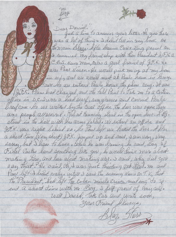 This is a truly unique find. This personal letter written by Legendary ecdysiast (born 1932) Blaze Starrs whose story detailing her life in and out of clothing was the subject of the book and subsequent film, Blaze. There is no date on the letter sent to a man named David but it is obviously a response to a letter sent to her. She explicitly states much was left out both the book and the movie and goes on to chronicle an encounter with then President JFK who apparently excused himself from a critical Cuban Missile Crisis meeting to have an interlude with the infamous dancer. She even includes a quote from JFK in reference to their tryst, "Boy, if Fidel Castro had something like you, he would think more about making love, and less about making war." Pretty incredible stuff here.