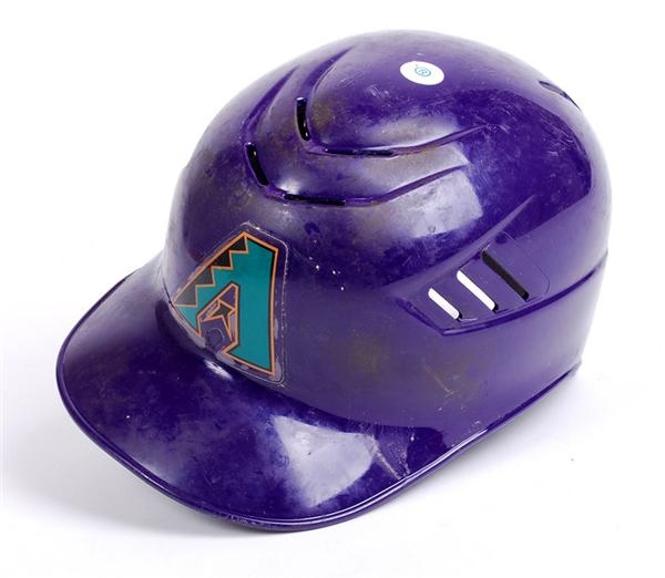 Rawlings Air Flo batting helmet with the number "15" decal on the back. The interior has a decal with size "7 3/8" and the size "7 3/8" is written twice in silver. MLB hologram affixed. Several scuffs on the surface and a nice coating of pinetar on the front. Shows moderate to heavy use.