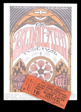 Considered the first super-group, Blind Faith was formed from the ashes of Cream and Traffic as Eric Clapton, Steve Winwood, and Rick Grech got together for informal jams. When the press and record companies got wind, they were pressured to go public, debuting on June 7th, 1969. By the end of August, only three months later, they had split. This astoundingly rare 8.5x11" handbill (EX) together with a NRMT unused ticket for the Blind Faith Festival August 16th in Santa Barbara, California represents an historic document of this short-lived group.