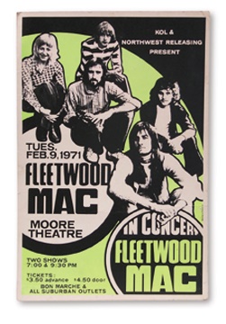 This super rare boxing style concert poster presents an early Fleetwood Mac appearance(pre Buckingham and Nicks) on February 9th at the Moore Theatre in Seattle, Washington. Pinholes, horizontal crease, VG-EX.
