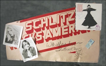 Schlitz Rocks America concession display poster signed, "With All Our Love Fleetwood Mac and Stevie" with a heart (41x18.25"). Plus, signed 8x10" promo glossy signed by Stevie, and 8x10" Christine McVie signed glossy, and a promo LP flat "Rock A Little" signed to Bramwell, "I Love You Stevie," and finally a ticketron ticket from 1982 Worcester, Mass. Show. Signed by Stevie, Lindsey, Mick and Christine. VG.