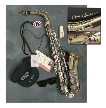 Unquestionably an opportunity of a lifetime. Unmistakenly an unequalled investment. Unbelievable looking in your home. A chance to own a piece of Musical Inaugural History. On January 20,1993 at the American Gala for the 52nd Presidential Inauguration at the Sheraton Washington Hotel, President Bill Clinton, Al Gore (probably President by Press time), Stevie Nicks, Mick Fleetwood and John McVie placed their signature upon this Buescher saxophone. Al, Stevie, Mick and John signed on the body and Mr. Clinton on the mouth piece. For security reasons the Secret Service took the piece to the President to sign. The Talent Pass, two room keys, inauguration button and amazingly the Secret Service agents tag are included from this event. To complete this more than awesome lot the consignor has included a Presidential seal baseball cap and Ray Ban "Blues Brothers" style sunglasses both signed by the President.