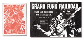 Pair of very early handbills for Pink Floyd concerts. One as opening act for Grand Funk in Texas May, 1970 (9.25x12") EX, and the other a San Francisco Benefit at the Fillmore Auditorium (5.5x7.5") light handling, VG-EX.
