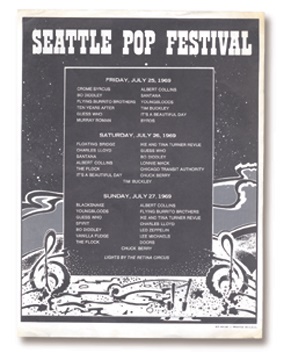 Two-sided handbill announces as amazing line-up of superstars for the 1969 Seattle Pop Festivals including Led Zeppelin, The Doors, The Byrds, Santana, Ike and Tina Turner, Flying Burrito Brothers, Chuck Berry, and many others on July 25th - 27th. The reverse has a map to the festival site. VG-EX.