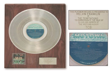 1968. "Taking Care Of Business" was a jointly recorded album by the Temps and Diana Ross& Co. Presented to Melvin Franklin, marking sales of 2 million for this Motown title.