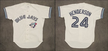 The toughest jersey of all from the master of base theft. Henderson played only 134 games for the blue birds, making this home white beauty as rare as a Montreal Expos fan. "Blue Jays" and logo bird cross chest, with "Henderson 24" on back. "Wilson [size] 44" tagging in collar, with "93" stitched just below. Front of jersey is trimmed at bottom as per Rickey's preference. Use is quite strong considering the shortened lifetime-obviously this is a guy whose hard-sliding style is tough on uniforms. LOA from the Blue Jays.