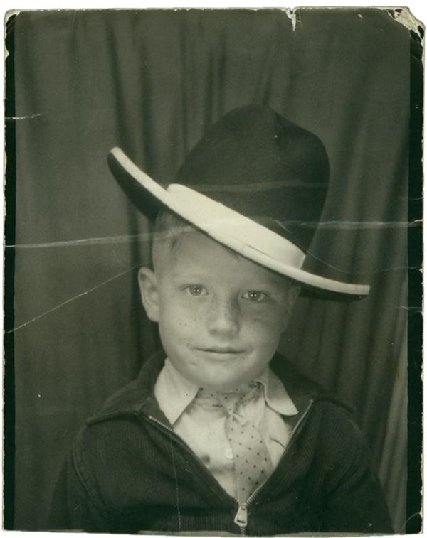 This vintage photograph captures a young Mickey Mantle at the age of 8, the earliest we have seen. From a coin operated photograph machine, it is the only surviving specimen. The image is accompanied by both a notarized Letter of Authenticity that details the provenance as well as a signed copy of Mickey Mantle: Before the Glory, by John G. Hall with a photo inside that explains it further.