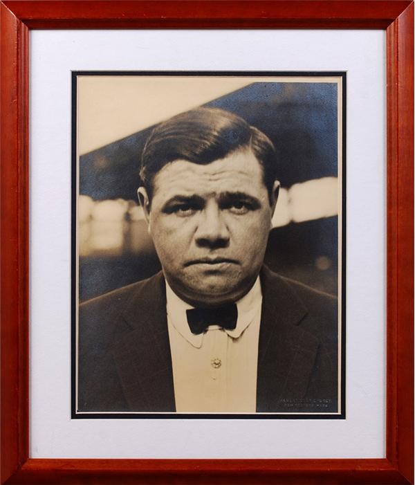 Sepia photo of Ruth wearing a bowtie at the ball park. Photographer's catouche (Albert Cook Church, New Bedford, Mass.) at the bottom right corner. EX-MT. Framed to 17 x 20''.
