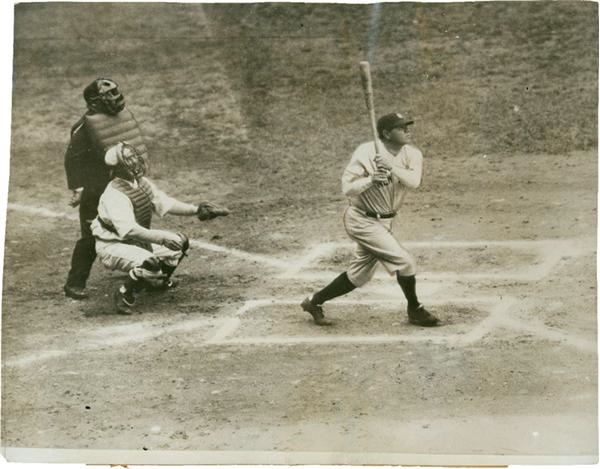 Stunning newsphoto of Babe Ruth hitting a home run in his first plate appearance of the magical 1932 season. Original news clipping attached to verso reads, “The Homerun Maker Begins Deliveries under $75,000 Contract.”