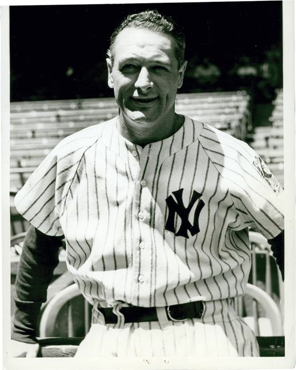 Spectacular newsphoto of Lou Gehrig standing in front of empty stands at Yankee Stadium, moments after the announcement from his doctors was made public. Original paper caption attached to the verso.