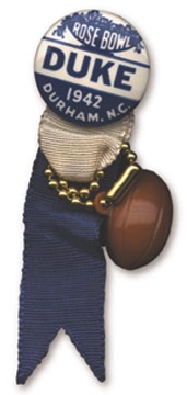 Fearing that a stadium packed with fans would prove too tempting a target for the Japanese bombers (who had hit Pearl Harbor only a month earlier), promoters moved the prestigious college football event to the North Carolina campus of Duke University, where this button was purchased. Button has a tiny bit of rust on back, but otherwise it's NRMT in appearance, as are the attached ribbon and football charm.