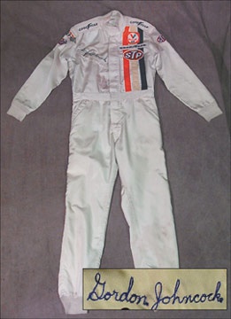 Grease-stained fireproof suit tore up the turns on the back of the Indy 500 winner. Blue chain stitching over breast pocket identifies suit as Johncock's, as do the numerous sponsorship patches from Valvoline, Goodyear, STP and more. Evidence of removed patches on chest and back are likely the result of a fractured sponsorship deal. Strong wear evident. From the Paul Hill Collection.