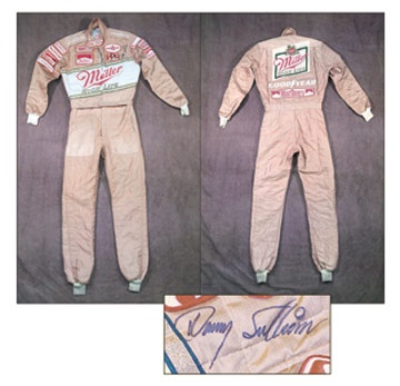 Striking gold fireproof suit was worn by the Indy 500 Champ. Sponsorship patches from Marlboro, Pennzoil, Monroe, Miller, and more abound. Tagging in collar speaks to the flame retardant nature of Nomex, and sets the date at "2/88." Black sharpie signature from Sullivan is on left chest. Light but evident wear.