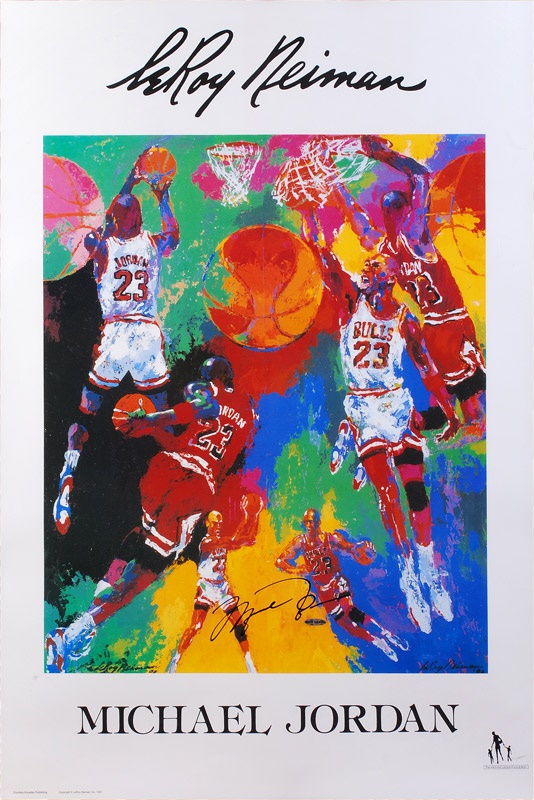The 24 x 36" Neiman lithograph is a bold and colorful composition that captures multiple images of NBA legend Michael Jordan. The colors are typical of Neiman's style and are vibrantly hued and the lithograph is signed by Michael Jordan in black sharpie. The lithograph has a UDA authentication for Jordan's mint signature. Mint.