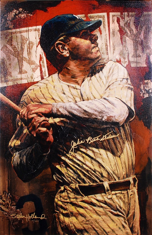 Stephen Holland has captured the Babe in his own style with this 28 x 41.5'' Giclee. This print is individually numbered out of a series of 25. Slight crease in the surface glaze just above Ruth's head that is mostly visible on the reverse. The Giclee is signed by Ruth's daughter Julia Ruth Stevens in gold and by Holland in the lower left.