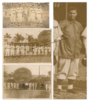 Fine 5x7" images taken with Monterrey when he was still a Negro Leaguer. Includes two team photographs, which together are essentially a panorama (he is in one of them). Lazaro Salazar is the manager. Third image of him in background of shot of the Blanco Brothers and Heredia. Obtained from one of Campy's teammates with arrow pointed to him and the players numbered below. O/w VG+.