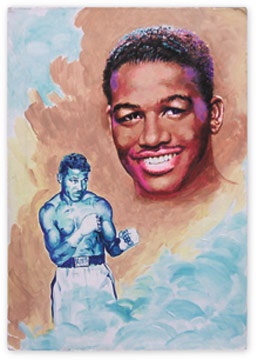 Spectacular oil paintings were used for the cover of this, the preeminent Mexican boxing magazine of the last few decades: Ring Mundial. These one-of-a-kind paintings which are mostly oil-on-canvas (they were then mounted on artist's board), each measure about 20x15". They are in EX-MT condition and were obtained from the daughter of Valente Perez, the sportsman-entrepreneur-artist who published the magazine and also did these paintings! A wonderful collection that we have sold many of over the last year. THIS IS THE LAST OF THE COLLECTION.